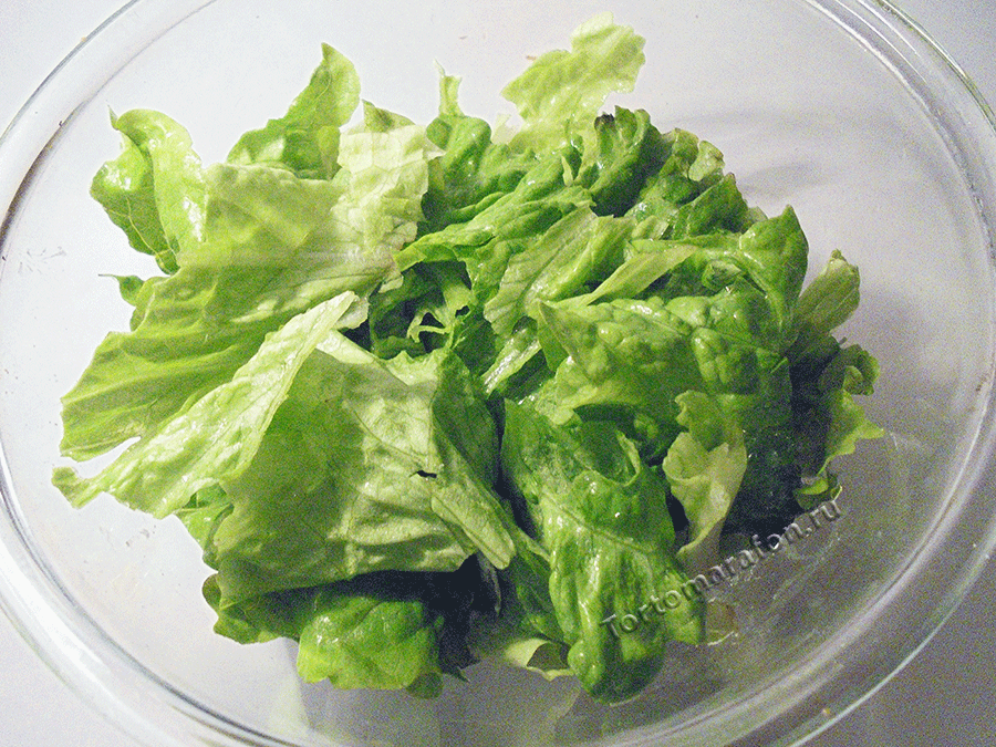 Далее перейдем к листовой составляющей нашего салата. Традиционно Цезарь готовиться из листового салата Ромен.