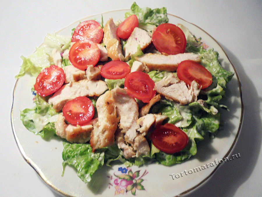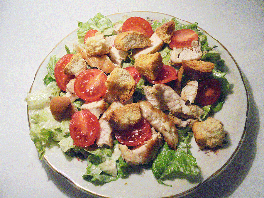 Соусом полейте смесь, перемешайте. Разбросайте резанные помидорки, сухарики и конечно же куриное мясо. Вуаля! Вот это чудесное творение природы, замечательный и необыкновенно вкусный шедевр! Ням-ням!