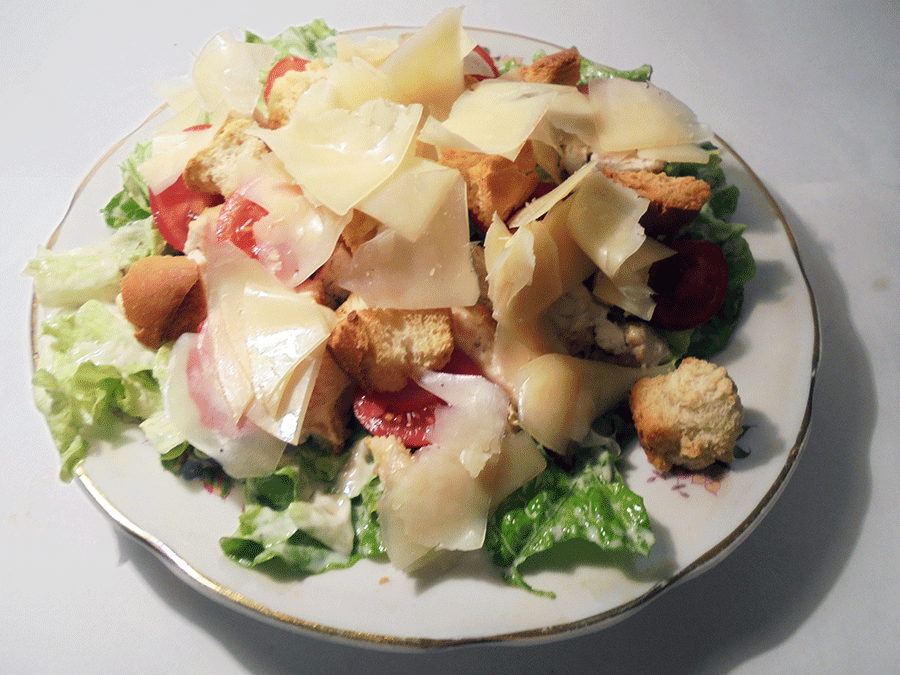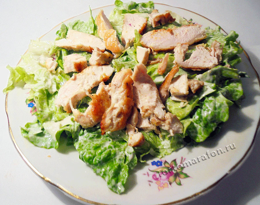 Готовые крутоны добавляют к салатным листьям и еще раз перемешивают. Крутоны довольно быстро размокают, поэтому закуску не рекомендуется делать заранее: чтобы салат «Цезарь» имел аппетитный вид, крутоны в него добавляют непосредственно перед самой подачей. Как вариант, сухарики можно положить на поверхность салата, выложенного на небольшие плоские тарелки, и заранее не перемешивать. Посыпают угощение остатками пармезана. Приятного аппетита!