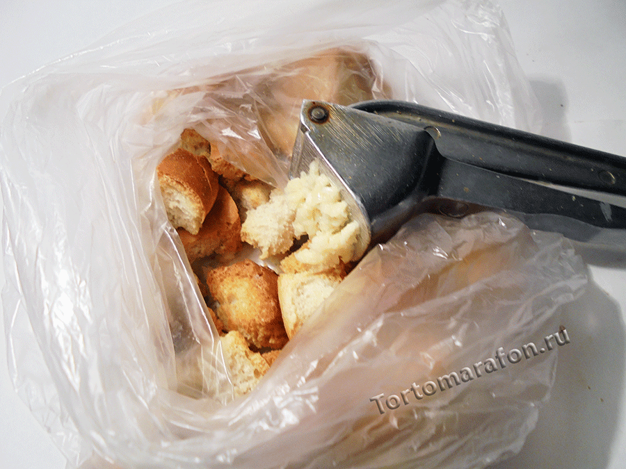 4. Теперь займитесь сухариками. Возьмите половинку батона, уберите с батона корочку. Разрежьте батон на овальные кусочки. Из них сделайте сухарики, размер сухариков определяйте самостоятельно, как любите.