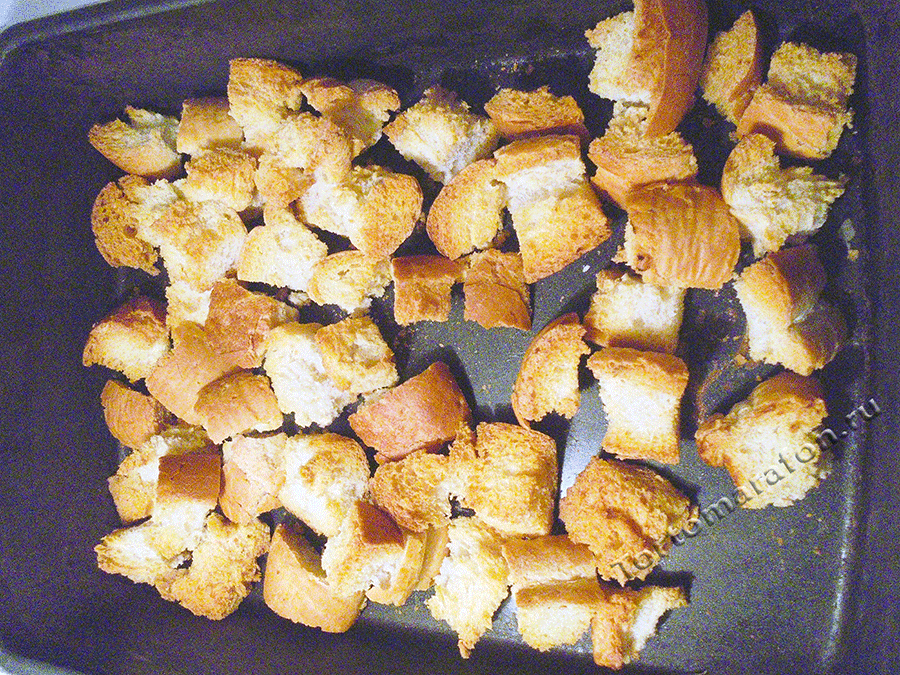 С багета или батона срезают корку (ее не выбрасывают, а высушивают и используют как панировку для жареной рыбы или котлет). Белый хлеб (мякоть) нарезают в форме кубиков (размер нарезки – совершенно произвольный). В сковородке разогревают оливковое масло (около двух столовых ложек) и обжаривают на нем подготовленные крутоны до тех пор, пока на них не начнут появляться следы «румянца» и приятный хруст. Сухарики ни в коем случае нельзя пережаривать!