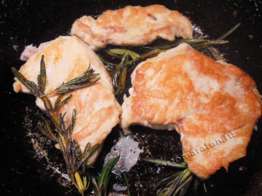 5. Поместите на сковородку сливочное масло кусочками, дождитесь пока оно расплавится, а после внесите кусочки курицы. Обжарьте их на медленном огне с двух сторон. Такие необыкновенные кусочки получатся с красивой зажаристой корочкой. Смотрите не съешьте))).