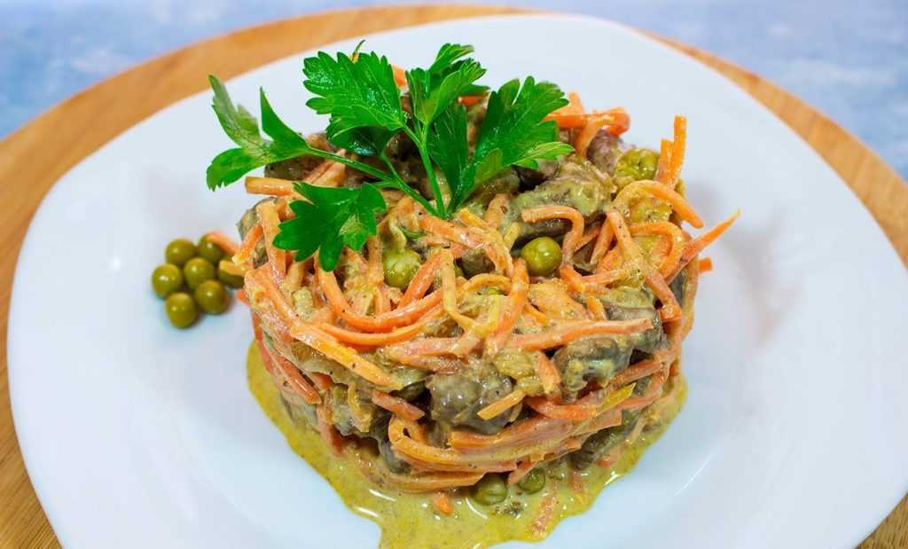 Рецепт салата с куриной печенью, корейской морковью и солеными огурцами.